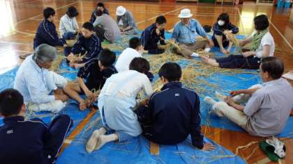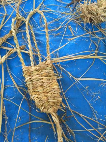 一本の藁が組み合わさって、少しずつ履物の形になってきました。