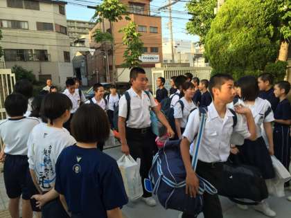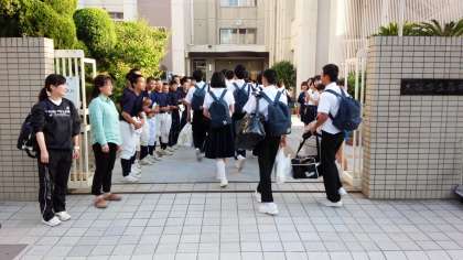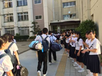 3年生の帰校を、保護者の皆さんや職員をはじめ、バレー部、バスケ部、野球部、吹奏楽部など、みんなでお迎えしました。