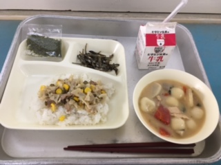 本日の給食は、れんこんのちらしずし ぞう煮 ごまめ でした。