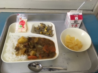 本日の給食は、牛肉と金時豆のカレーライス ごぼうサラダ パインアップルでした。