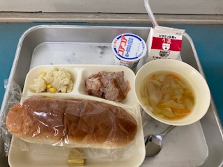 本日の給食は、豚肉のガーリック焼き スープ カリフラワーとコーンのサラダ ヨーグルト でした。