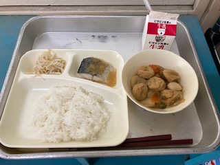 本日の給食は、さごしのおろしじょうゆかけ 一口がんもとさといものみそ煮 もやしのゆずの香あえ