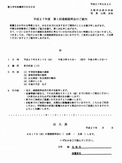 本日、第1回進路説明会のご案内と出欠票を配布いたします。