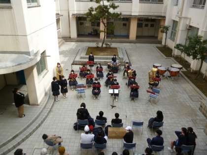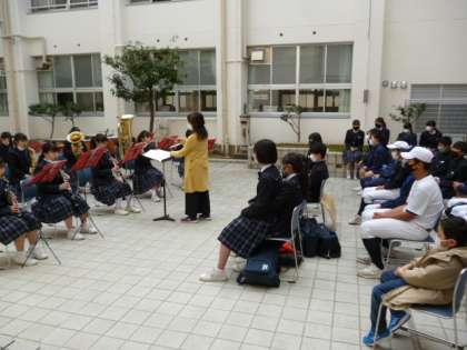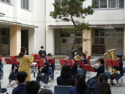 修了式、終学活が終わった放課後、吹奏楽部は、中庭でミニコンサートが開かれました。一人ひとりが心を込めて奏でる音が校内に響き渡りました。