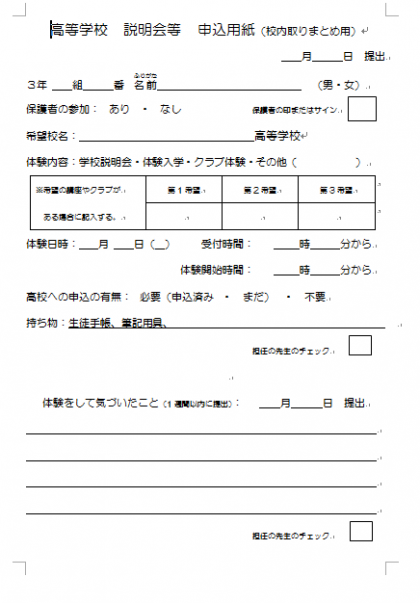 高等学校に行く場合には、締切日より余裕をもって早めに申込用紙を提出してください。