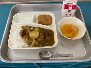 今日の給食は、カツカレーライス フルーツゼリー でした。