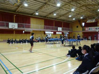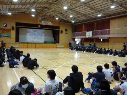 1年生 6時限目は、「部活動紹介」が体育館で行われました。各部活動の代表が、日ごろの活動の様子をスライドや作品、実技をみせたりして、紹介しました。