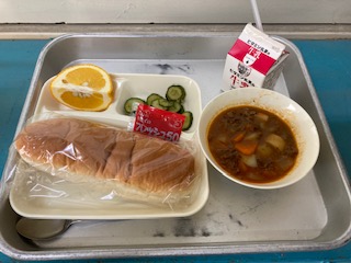 今日の給食は、ビーフシチュー きゅうりのサラダ あまなつかん でした。