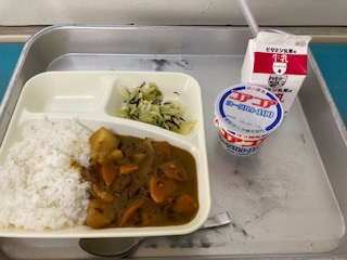 今日の給食は、牛肉と大豆のカレーライス キャベツのひじきドレッシング ヨーグルト でした。