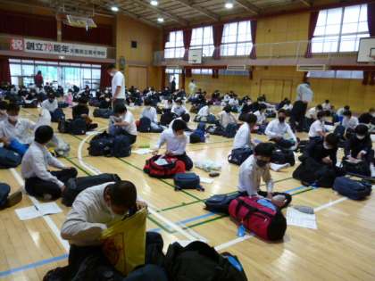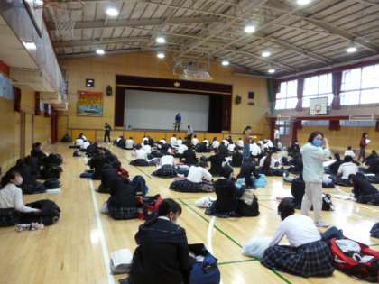 修学旅行の前日指導で、団体で行動するうえで注意すること、持ち物の確認、健康についてなどお話を聞きました。