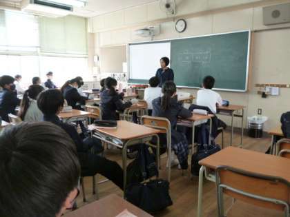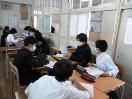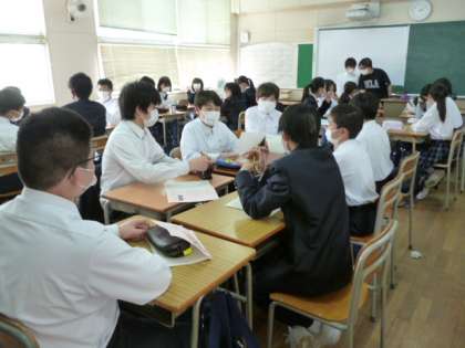 1−1は各班の活動で相談しています。1−2は、担任の先生の説明をきいています。