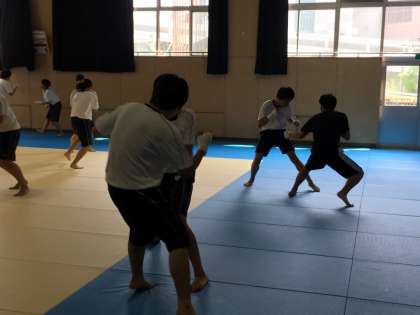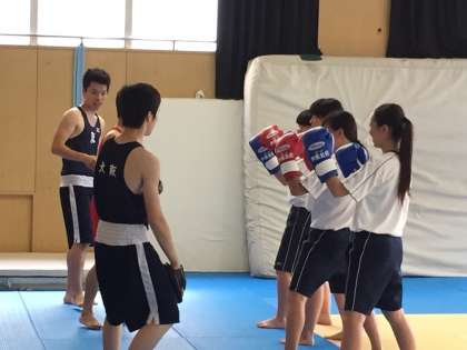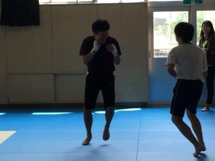 女子はミット打ち、男子は膝さわりスパーリングをしています。