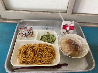 今日の給食は、スパゲッティミートソース きゅうりのピクルス アーモンドフィッシュ 発酵乳 でした。