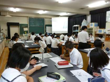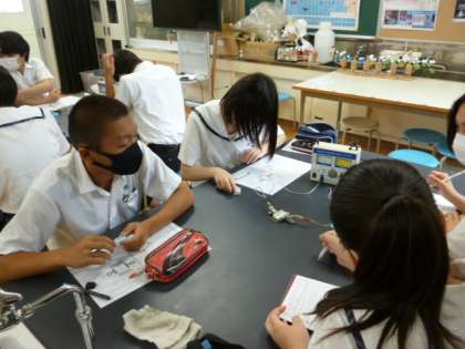 先生の説明を聞いて、実験をすることができました。どの班も、結果が表れて確認できたようです。