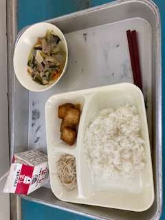 今日の給食は、中華煮、あつあげのピリ辛じょうゆがけ、もやしの中華あえ でした。(写真の向きが変になっており、すみません)