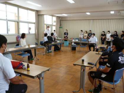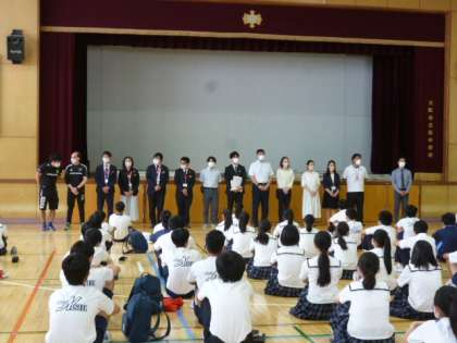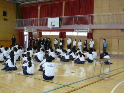 体育館に集合した3年生の前に、出前授業をしてくださる高等学校の先生方が現れ、紹介されました。その後、各教室に分かれて、出前授業を2種類体験しました。