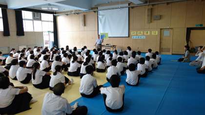 先日、各クラスで九条の町の歴史について話を聞き、学びましたが、今日は、全員で、九条の町の名前の由来などを聞きました。