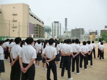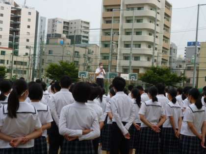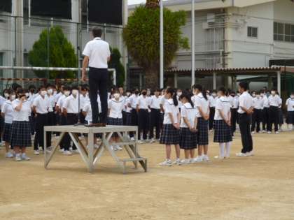 曇り空で、湿度の高い朝となりました。生徒たちは、時間通りに運動場に整列し、全校朝礼が行われ、校長先生のお話を聞きました。