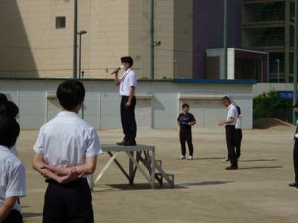 校長先生のお話の後、3週間の教育実習が終わり、教育実習の先生3名の挨拶がありました。1人ずつ、生徒のみなさんへお礼の言葉と、伝えたいことを話されました。