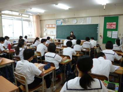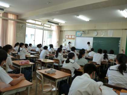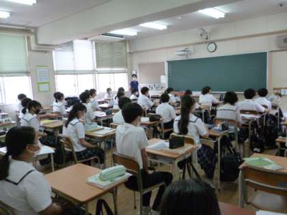 昨日からの雨が少し残り、運動場の状態が悪いため、教室に入り放送で全校朝礼が行われました。校長先生のお話をしっかり聞いています。