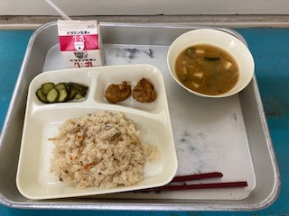 今日の給食は、豚肉のたつたあげ みそ汁 きゅうりの甘酢づけ かやくごはん でした。
