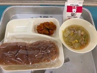 今日の給食は、さけのつけ焼き みそ汁 とうがんの煮もの 焼きのり でした。