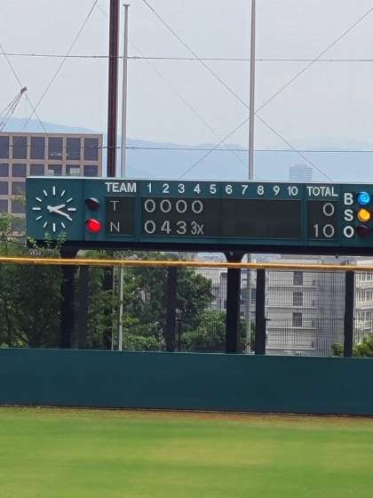 ランニング本塁打を含めて、たくさん長打が出て、最後は能勢があわや野球場のスタンドインかと思わせるフェンス直撃の二塁打を放ち、コールド勝ちを決めました。