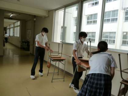教室、廊下、トイレ等の掃除を念入りにしました。放課後は、油引きのため、机を廊下に出しました。