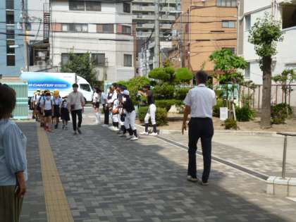 今日の午後は、小中連携の一環として、中学校部活動見学が行われました。西中学校校区の九条北小、九条東小、九条南小学校の6年生が西中学校に登校するところを出迎えました。武道場で説明を聞いた後、各部活動の様子を見て回りました。