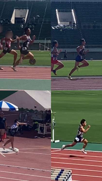 トラック種目では、男子150mの大畠君が6組2位、女子800mの上平さんは自己ベストを更新し総合11位でした。男子1年100mの平野君は決勝に進出し総合8位でした。3年生の滝本さんは100mと150mに出場し、どちらの種目でも決勝に進出し、100mでは総合2位でした。