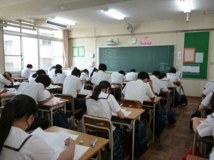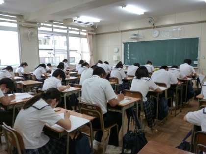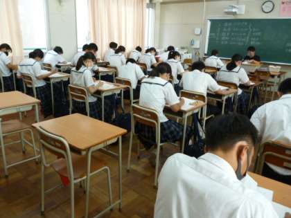 緊張感のある教室で、テストが行われ、問題に集中して取り組んでいました。