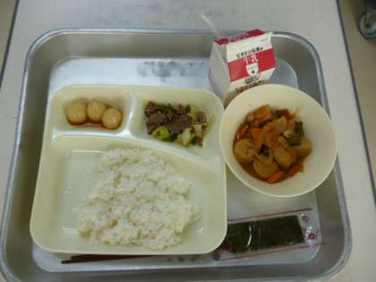 今日の給食は、一口がんもとさといものみそ煮 牛肉と野菜のいため物 みたらしだんご 焼きのり ごはん 牛乳 でいため