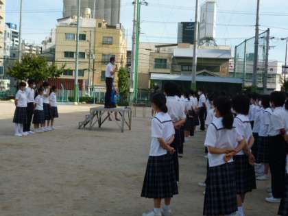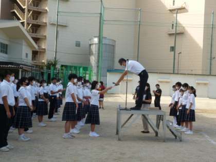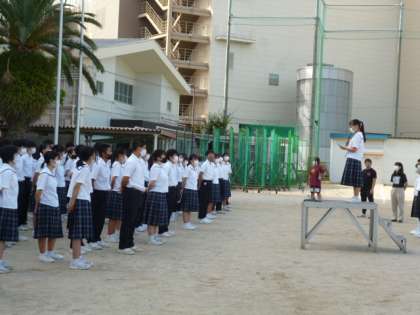 快晴の空のもと、元気に生徒たちが登校し、運動場で全校朝礼が行われました。