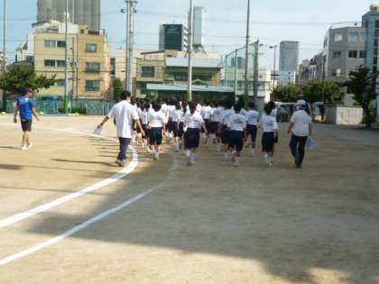 1年生は、1・2時限目です。グランドに出て、行進の練習をしました。