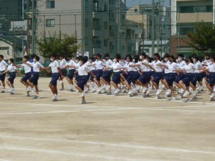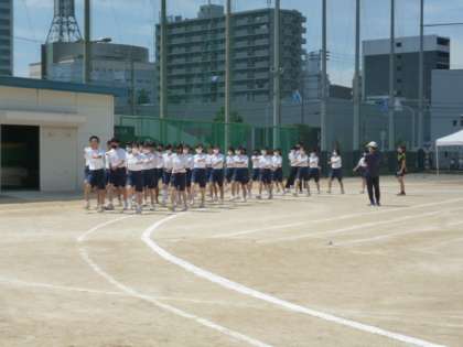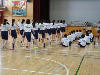 まず体育館で行進の練習を行いましのた。その後、運動場に出て入場行進の練習をしました。