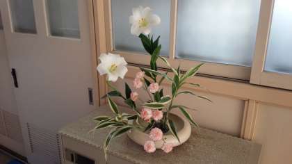 先日、ホームページでも紹介した校長室前の生け花が、きれいに咲きました。