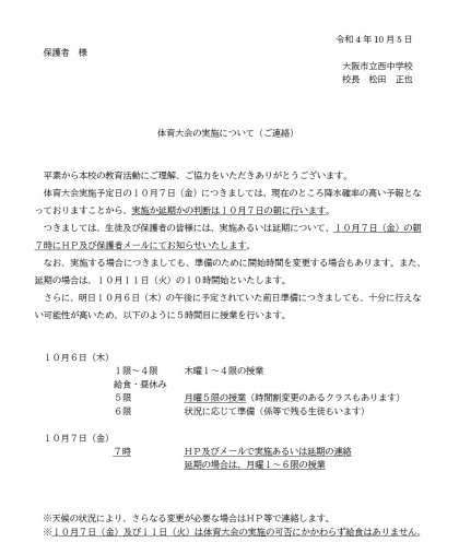 10月7日の体育大会当日は雨天の予報となっております。体育大会の実施及び準備について、明日以降の予定を本日以下のように文書で配布いたしました。ご確認ください。