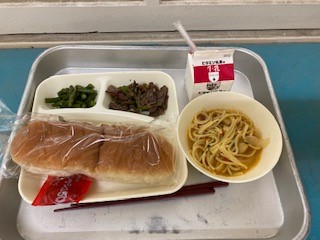 今日の給食は、牛肉の香味焼き ほたて貝とトマトのスープスパゲッティ さんどまめのサラダ でした。