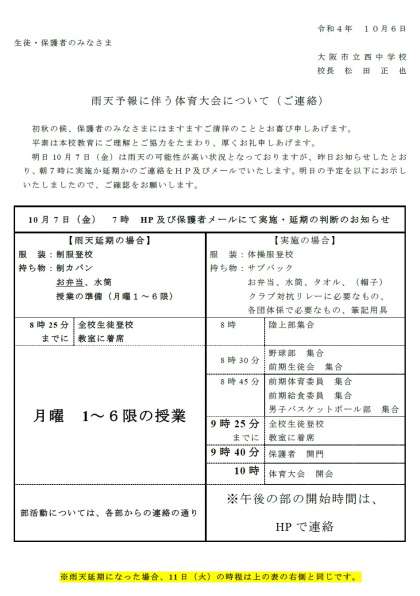 明日は、雨天の予報となっております。明日の朝7時に本HPとメールで連絡いたしますが、以下のような予定となっておりますので、ご確認よろしくお願いします。生徒たちには本日の終学活でこの文書を配布し、確認しております。