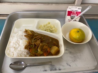 今日の給食は、ポークカレーライス(米粉) サワーキャベツ みかん でした。