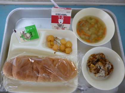 今日の給食は、なすのミートグラタン、鶏肉と野菜のスープ、さくらんぼ、コッペパン、牛乳 でした。