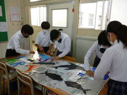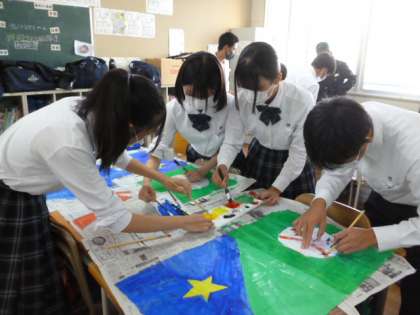各班でビニールシートにデザインを描き、鮮やかな色を塗り始めています。