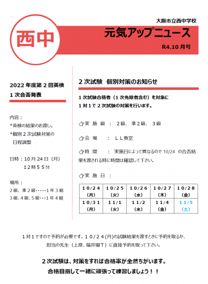 本校の元気アップ事業で第2回の英語検定試験を受検した方への連絡です。月曜日に合格発表を行います。あわせて合格者は、二次試験対策講座の受講予定を確認します。詳しくは以下のニュースをご覧ください。生徒には昨日配布をしております。
