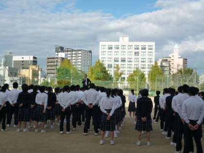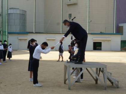 さわやかな晴天となりました。今日も運動場に整列して、全校朝礼が行われました。