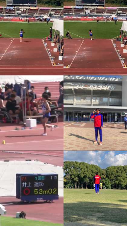 治療・リハビリを続けながらの出場で、普段通りのパフォーマンスをすることは厳しい状況でしたが、今できることを確実におさえて、3回の試技を投げ切ることができました。1投目は最後の踏み込みが少し甘かったのですが、記録を残すことができました。このコンディションでここまで投げられるのであればと55mオーバーを狙いましたが、2投目は惜しくもファウルとなってしまいました。今日の試技の中で一番上手くいき目標にしていた記録にも届きそうだったので、悔しさは残りますが、井上君らしい気合いの入った試技をすることができました。3投目はショートでしたが、最後まで諦めずに粘り強い投げを見せてくれました。