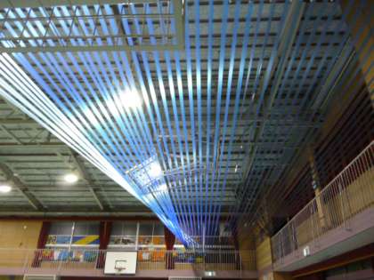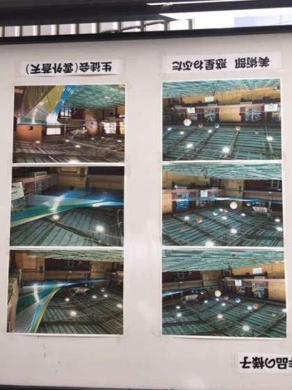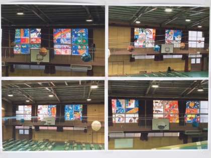 体育館では、2年のステンドグラス、美術部「惑星ねぶた」、生徒会「雲外蒼天」の展示です。