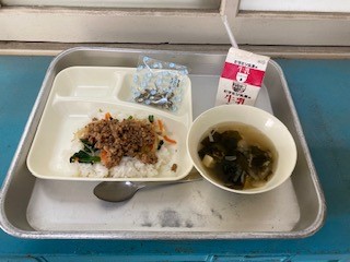 今日の給食は、ビビンバ わかめスープ アーモンドフィッシュ でした。