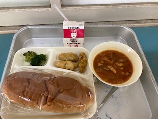 今日の給食は、白身魚フリッター ミネストローネ ブロッコリーのサラダ でした。