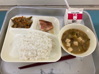 今日の給食は、 あかうおのしょうゆだれがけ なめこのみそ汁 きんぴらごぼう でした。