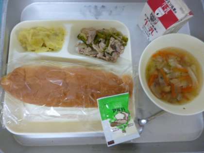 今日の給食は、豚肉と野菜のソテー スープ スィートポテト コッペパン 牛乳 でした。